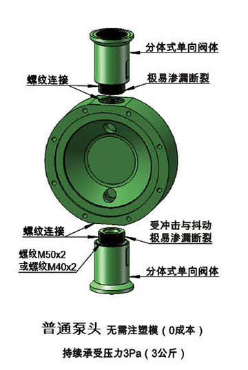 | 現(xiàn)在市場(chǎng)上的計(jì)量泵大多使用的是普通泵頭。就是采用PVC圓棒用車床加工的方式生產(chǎn)。兩端放球閥的地方只能采取內(nèi)外螺紋連接方式。螺紋越大,圓棒的厚度就會(huì)越大,增加的成本會(huì)翻倍。300毫米以上PVC圓棒國(guó)產(chǎn)幾乎生產(chǎn)不出來(lái)。德國(guó)進(jìn)口價(jià)格比國(guó)產(chǎn)高兩倍還多。圓棒厚度越薄,成本越低,但強(qiáng)度也越差。結(jié)果是泵頭所承受的壓力不高,計(jì)量泵是脈沖式運(yùn)行,沖擊力與抖動(dòng)力很大,所以,泵頭連接部位容易斷裂滲漏,大大減少了計(jì)量泵的使用壽命。 | ![]() |