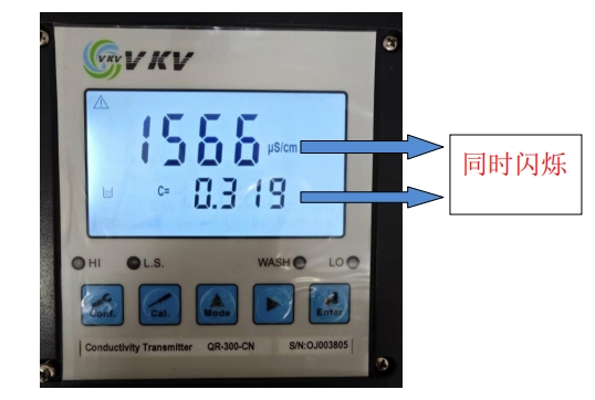 5. 根據(jù)電極線標(biāo)號(hào) C 的數(shù)值選擇與之最接近的檔位電導(dǎo)預(yù)設(shè)值:0.0100、0.100、0.500、10.00(例如電極標(biāo)號(hào)數(shù)值 C=0.3188,則選擇C=0.500 檔位)通過(guò)▲ 或 ? 鍵來(lái)變更檔位。